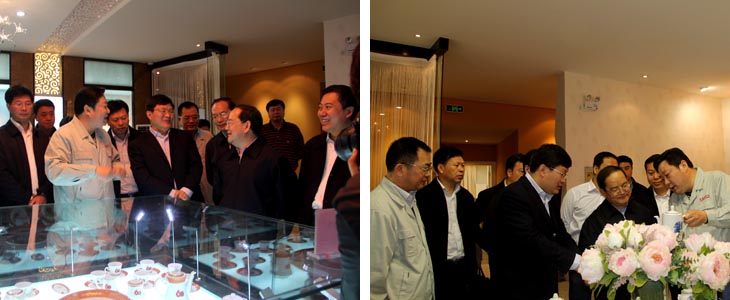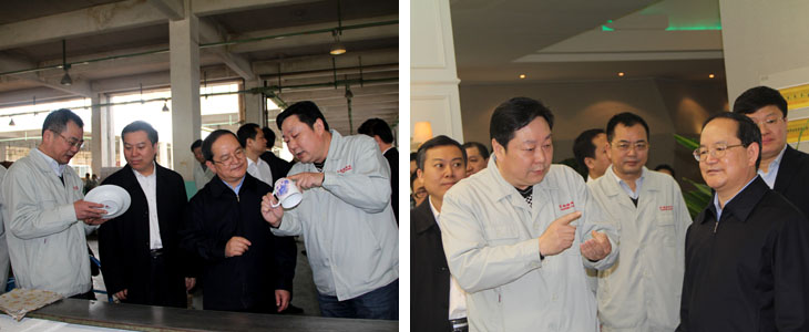 2012年4月6日江西省人民政府省長(zhǎng)鹿心社一行在市委書(shū)記鄧保生、市長(zhǎng)劉昌林等省市領(lǐng)導(dǎo)的陪同下來(lái)我司視察工作,鹿心社省長(zhǎng)一行參觀了工廠生產(chǎn)車間、國(guó)瓷館,詳細(xì)了解了公司的生產(chǎn)運(yùn)營(yíng)情 況并對(duì)公司產(chǎn)品贊不絕口。視察期間,鹿心社省長(zhǎng)對(duì)公司給予了高度評(píng)價(jià):“你們公司為景德鎮(zhèn)爭(zhēng)了光,為江西爭(zhēng)了光,為國(guó)家爭(zhēng)了光。"并希望公司能牢牢抓住精品路線,抓住高端市場(chǎng),搞活機(jī)制,繼續(xù)做的更大更好。