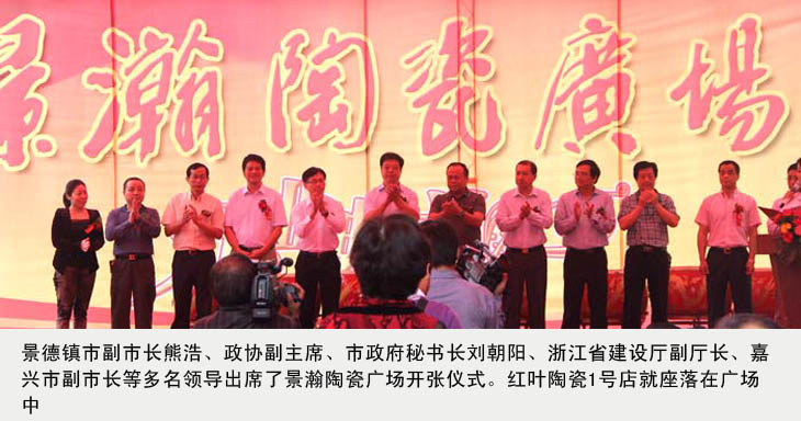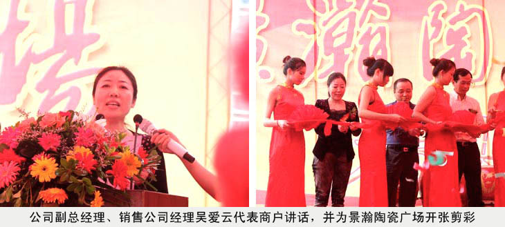 在景瀚陶瓷廣場落成開業(yè)慶典儀式上,公司副總吳愛云受王耀董事長委托,代表景德鎮(zhèn)陶瓷股份有限公司,代表紅葉陶瓷1號店,代表所有進(jìn)駐的業(yè)主們發(fā)言。她說:今天是五星級陶瓷購物天堂——景瀚陶瓷廣場開業(yè)的大好日子,受王耀董事長委托,我僅代表景德鎮(zhèn)陶瓷股份有限公司,代表紅葉陶瓷1號店,代表所有進(jìn)駐的業(yè)主們,對景翰陶瓷廣場的開業(yè)表示熱烈的祝賀。祝景瀚陶瓷廣場開業(yè)大吉,生意興隆。