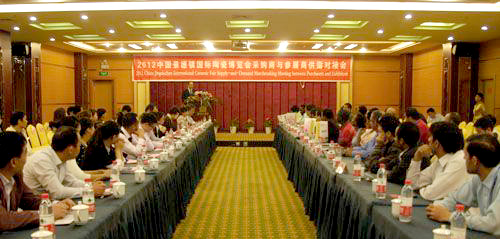 10月18日下午,由瓷博會(huì)、省陶瓷公司主辦的“2012年中國(guó)景德鎮(zhèn)國(guó)際陶瓷博覽會(huì)采購(gòu)商與參展企業(yè)對(duì)接會(huì)”在開門子三樓會(huì)議室舉行。來自10余個(gè)國(guó)家的40家采購(gòu)商以及由瓷博會(huì)根據(jù)采購(gòu)需求挑選出來的55家參展商參加了此次對(duì)接會(huì)議。副市長(zhǎng)張春萍出席會(huì)議并致辭。