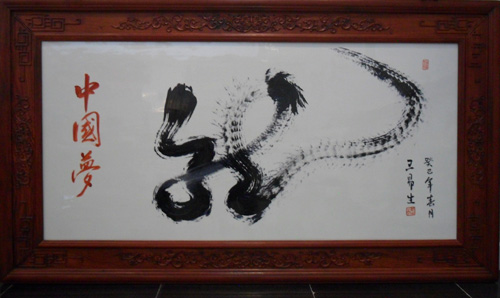 在當(dāng)天的活動(dòng)中,王易生的草書一筆龍,已達(dá)到了較高的藝術(shù)境界,其一氣呵成的書寫方式在書畫界更是一絕?!褒垺弊值那安肯笳髦腥A兒女祈福納祥,國泰民安;中部象征著中華大地改革之勢(shì),波瀾壯闊;尾部象征著中華民族偉大復(fù)興、巨龍騰飛、正當(dāng)其時(shí)。“龍尾”,似騰龍奔逐,奇幻莫測(cè),給人極強(qiáng)的心靈震撼。