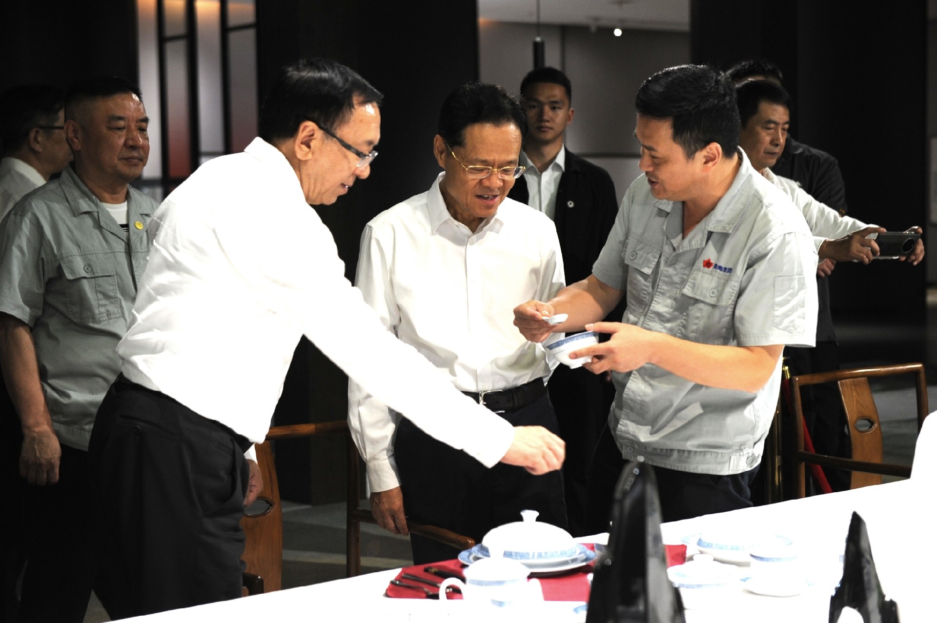 在國瓷館展廳,鄧景揚向陳武介紹了紅葉陶瓷產(chǎn)品特色和先進制瓷工藝,重點講述了一系列“國瓷”“國禮”故事。陳武對精美的產(chǎn)品給予高度評價。